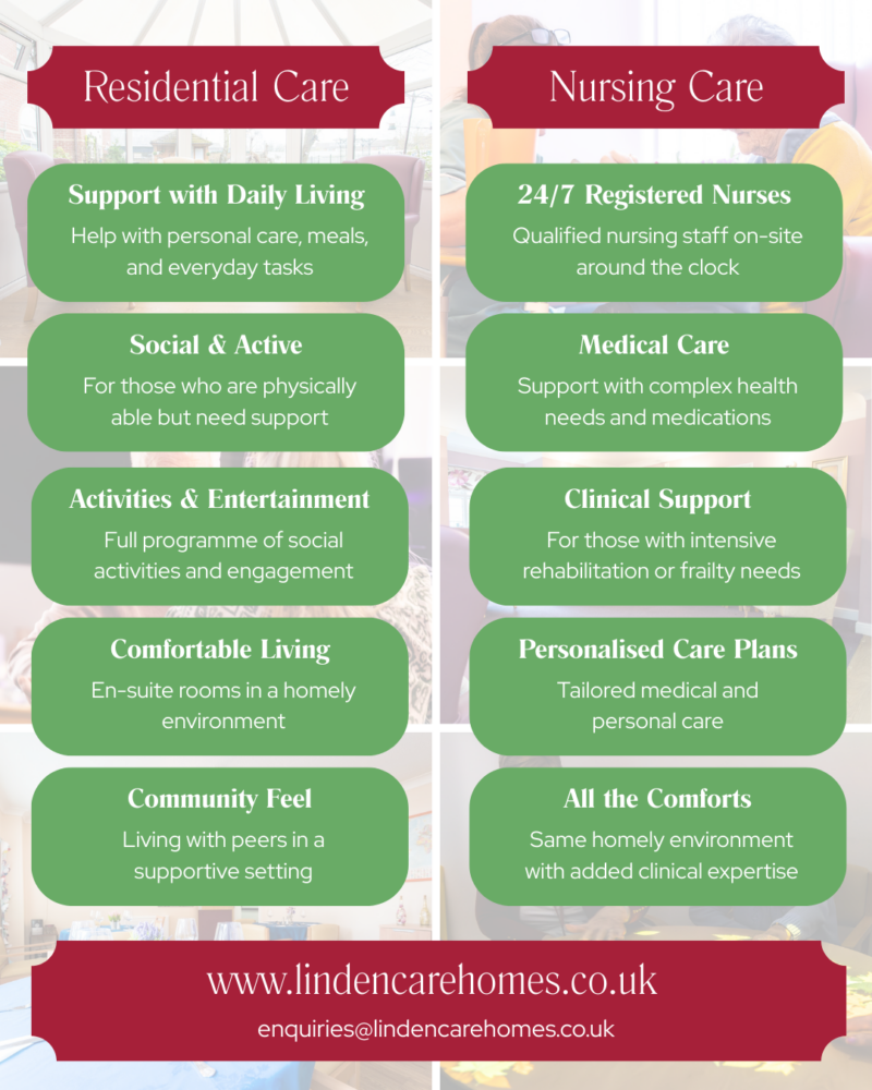 Both options at Linden Care Homes offer the same warm, welcoming environment – just different levels of medical support…
